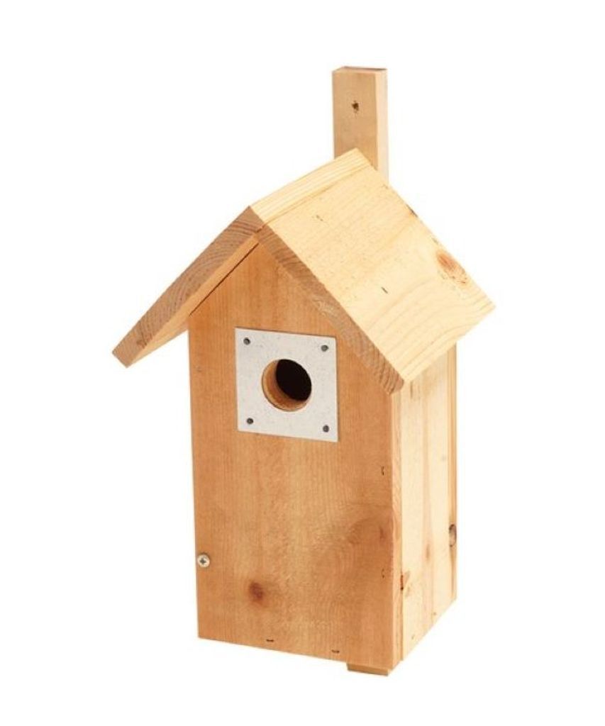 För att skydda boet från rovdjur såsom ekorrar och hackspettar, har holken ett hackskydd runt ingångshålet.