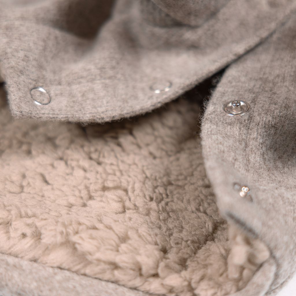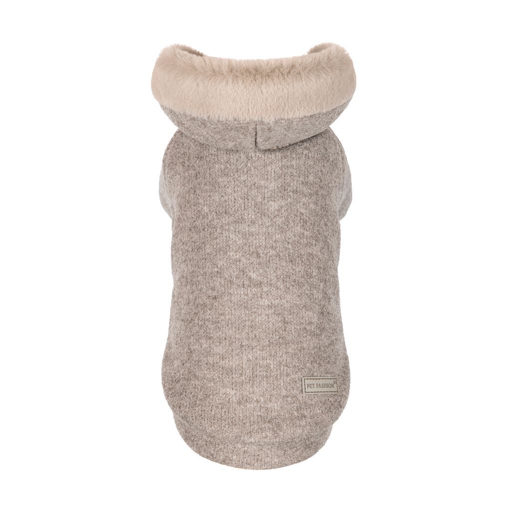Den är tillverkad av borstad stickat tyg med foder av päls som ger värme. Huvan är både fodrad och kantad med päls vilket gör det skönt i blåsigt väder så ditt husdjur slipper att frysa. Den kan knäppas över ryggen med en knapp och har en koppelöppning vid nacken.
