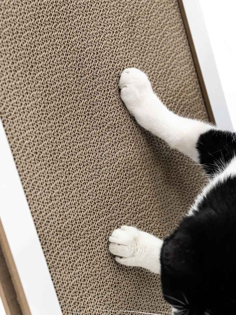 Klösbrädan är gjord på återvunnen kartong med ett stabilt trästativ och även tillverkad av rejäl wellpapp som kommer hålla länge för många klös. Du kan flytta den vart du vill då den är väldigt stadig och lätt, kanske på din katts favorit ställe, hur praktiskt är inte det?