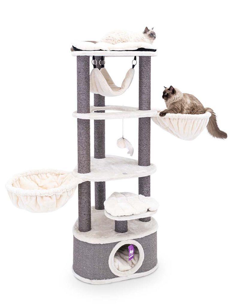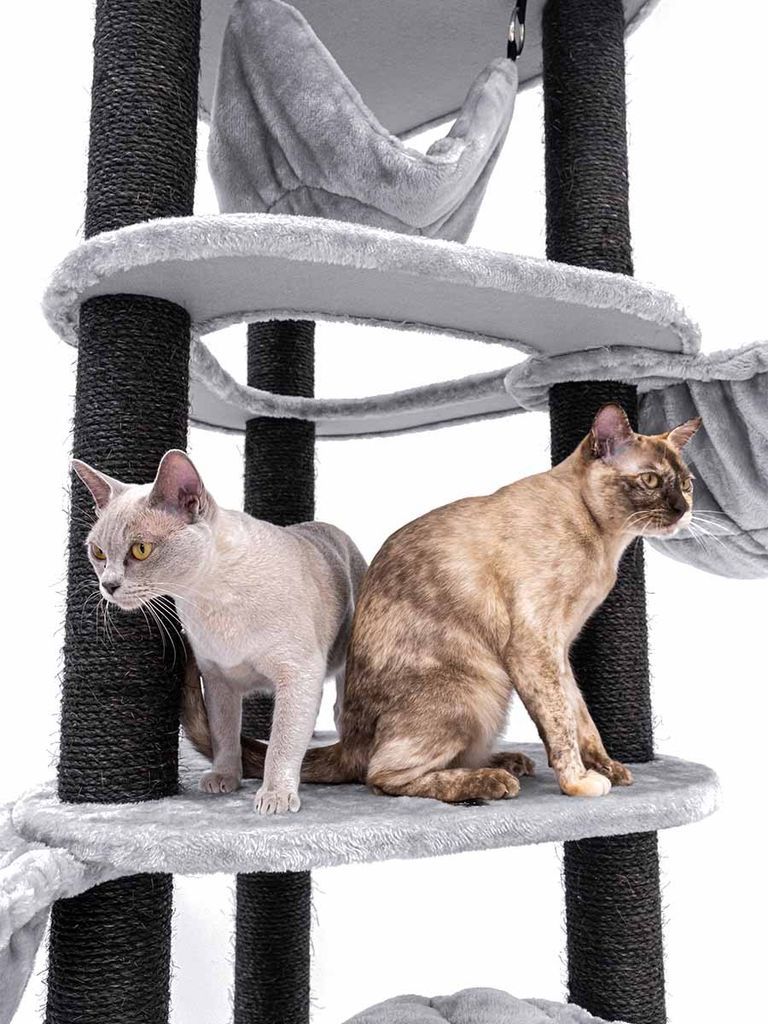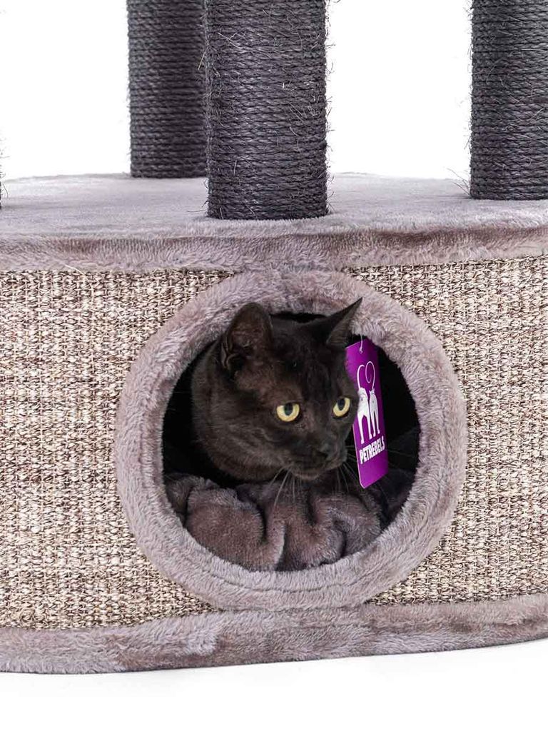Materialet är mjukt plysch och sisal som är slitstarkt och därför hållbart. Det gosiga tyget kommer ge dina katter en god sömn, antingen i hängmattorna eller i grottan. Kattgrottan har ett mjukt underlag och är i mörkare miljö som gör att din katt kommer trivas om den vill vara ifred.