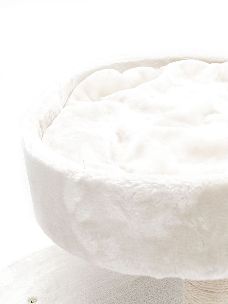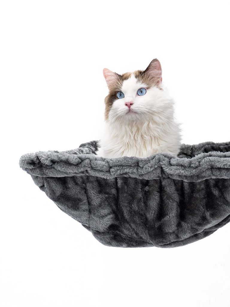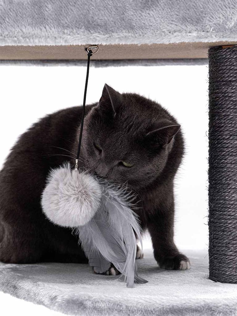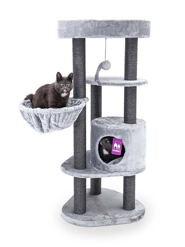 Klösträdet har tjocka klöspelare som är 9 cm i diameter vilket passar bra till klöslek för din katt. Det finns en super mysig hängmatta din katt kan vila i för att få en god sömn men också en grotta som din katt kan välja att sova i för att få vara ensam men också i en mörkare miljö. Din katt kan klättra högst upp för att få syn över hela rummet, vilket är en grej många katter uppskattar.