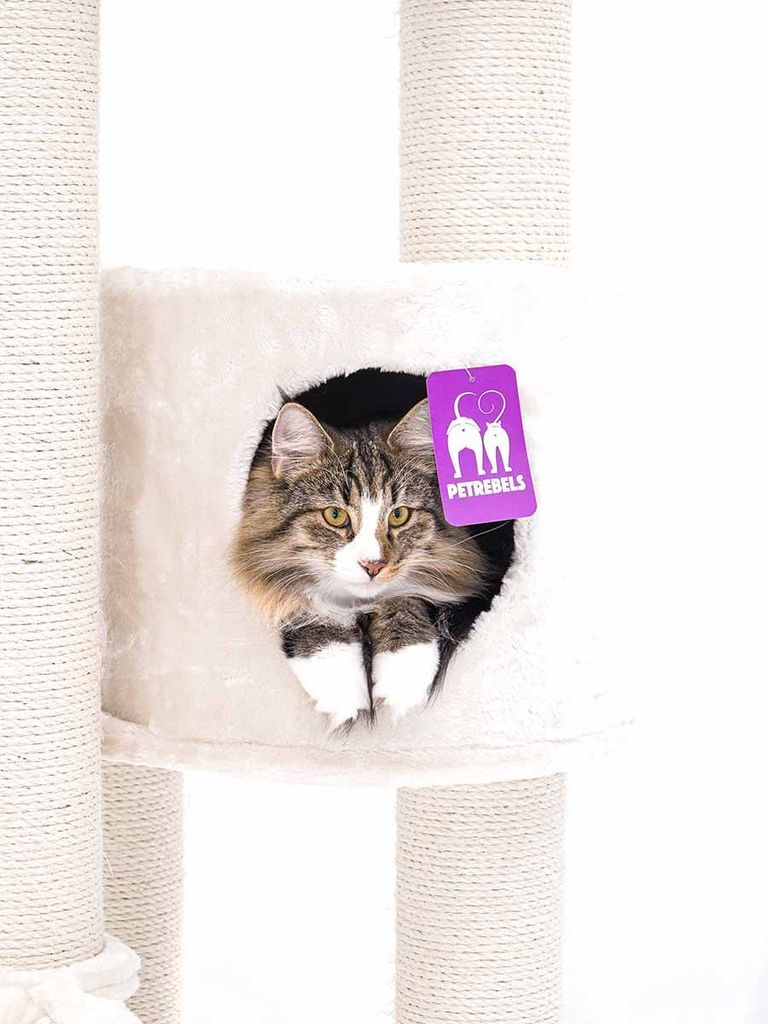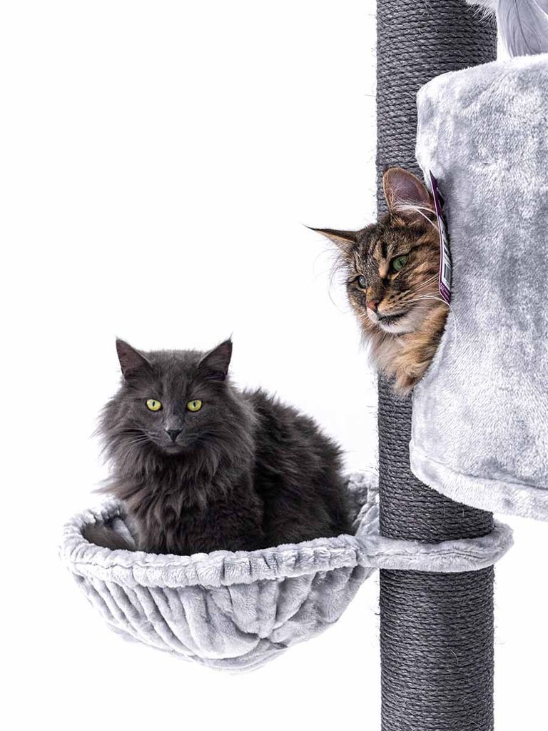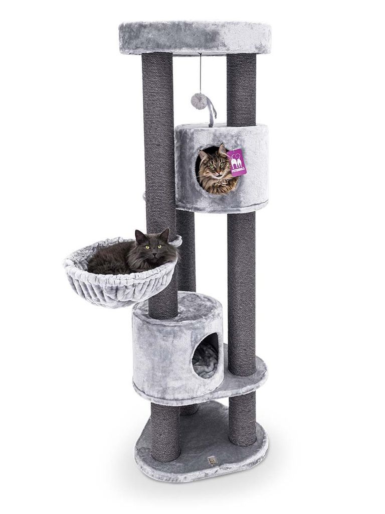 Materialet är gosigt och i mjuk plysch med ett sisal som är slitstarkt och hållbart vilket passar aktiva busiga katter som bäst. Klösträdet har många bekväma ställen din katt kan sova på, den mjuka hängmattan som kommer hålla din katt varm och bekväm men också två kojor din katt kan lägga sig i för att få vara ifred i en mörkare miljö som är gosig.