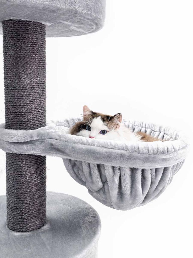 Klösträdet har tjocka klöspelare och passar bra för klättring, vila, lek och såklart en massa klösande. Ytan är stor och din katt kan både sova i en mysig hängmatta som sitter högt upp, eller en gosig grotta som din katt kan gå in i för att få vara ifred.