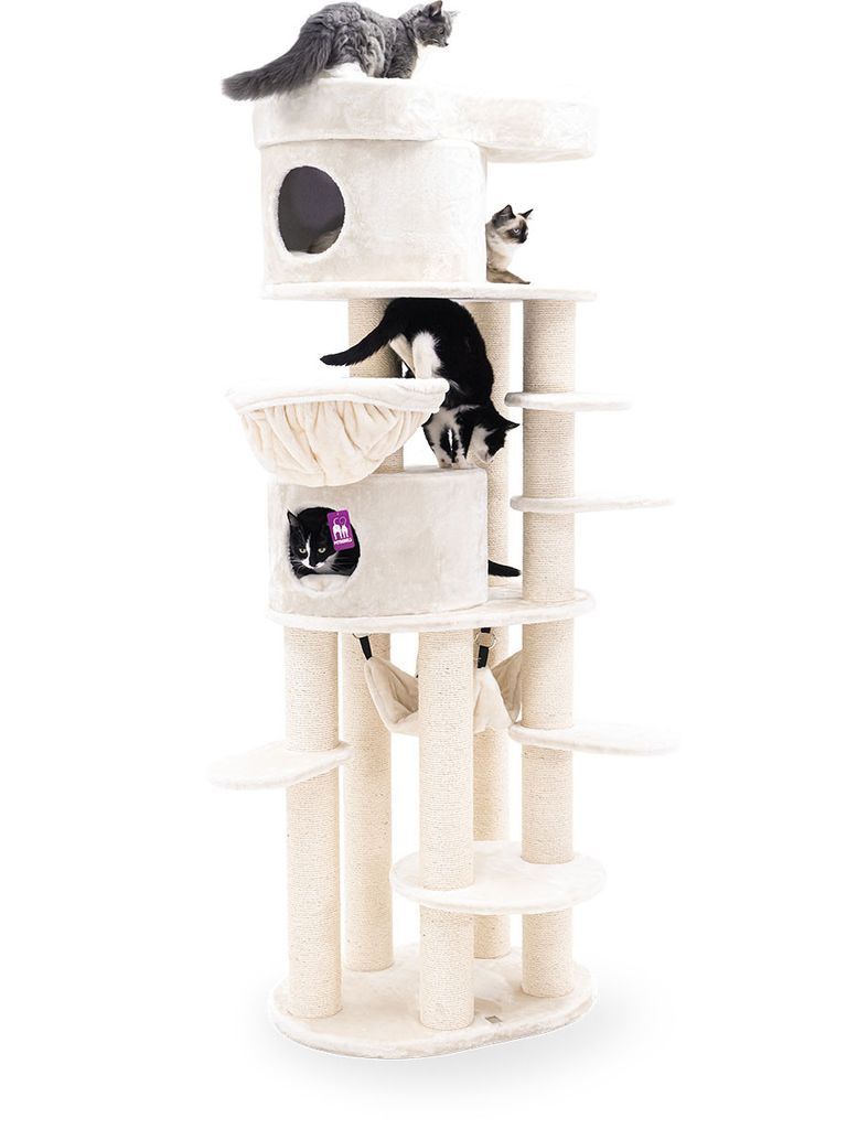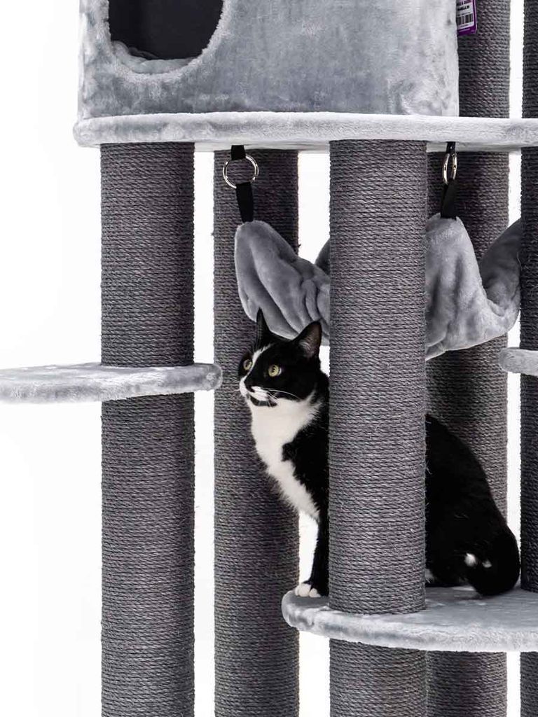 Det finns massor av delar på klösträdet där din katt kan hoppa och klättra vilket tröttar ut din katt så din kompis får en djup natts sömn. Eller om den behöver vila då den antigen kan lägga sig i hängmattan eller krypa in i en mysig mörk liten koja där den får vara alldeles ifred.