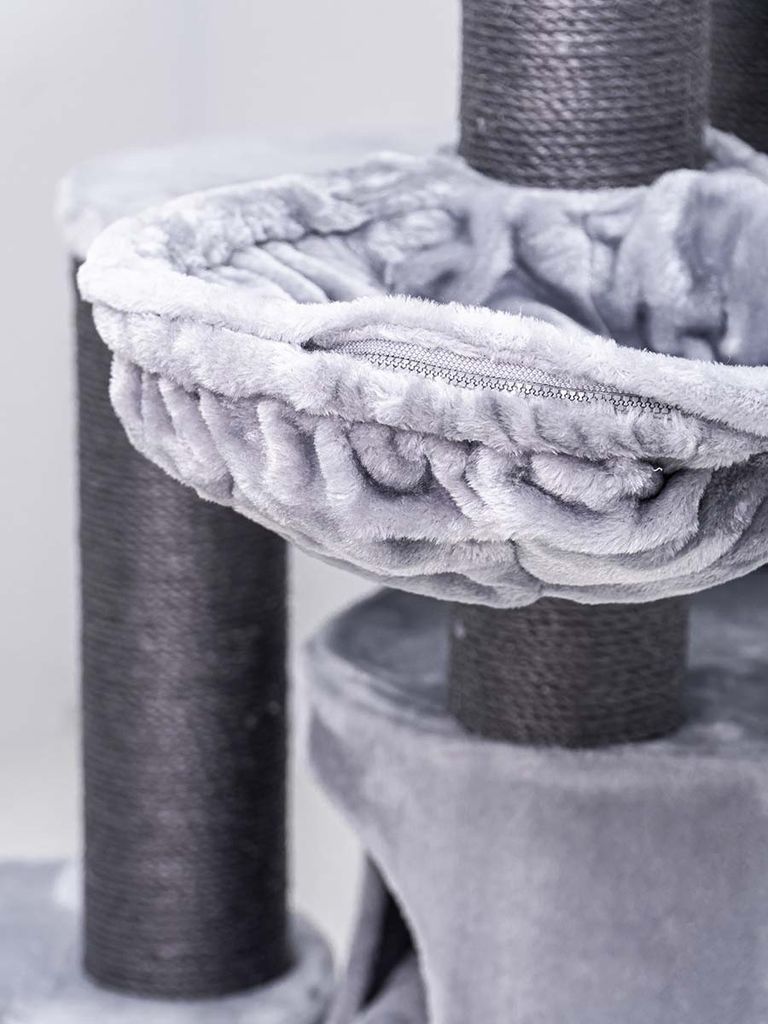 Denna katt möbeln har höga och starka klöspelare för att din katt ska ordentligt kunna sträcka ut sig och klösa. Det finns även två stycken mjuka hängmattor i plysch som kommer ge dina katter en djup sömn i en gosig plats. Klösträdet har även en större korg din katt kan gå in i för och sova i mörkare miljö med gosigt underlag.