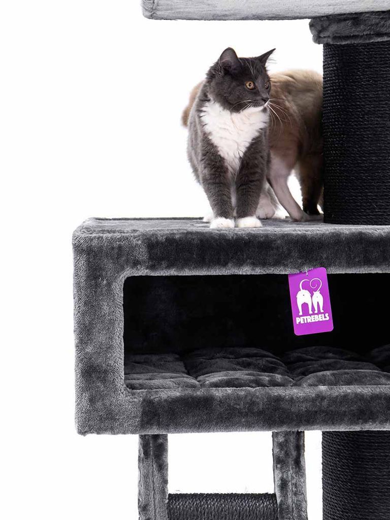 Din katt kan leka, vila och klättra i detta klösträd vilket är perfekt för aktiva katter som gillar att vara för sig själva. Katt möbeln passar alla olika katter från äldre till yngre då trappstegen gör det enklare att ta sig upp för. Det är en mjuk kudde i grottan så din katt kan få en gosig och bekväm sömn i sitt egna paradis där ingen annan kan störa.
