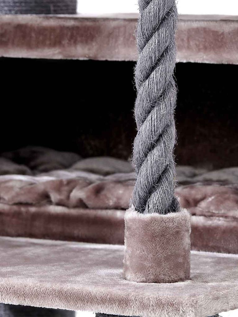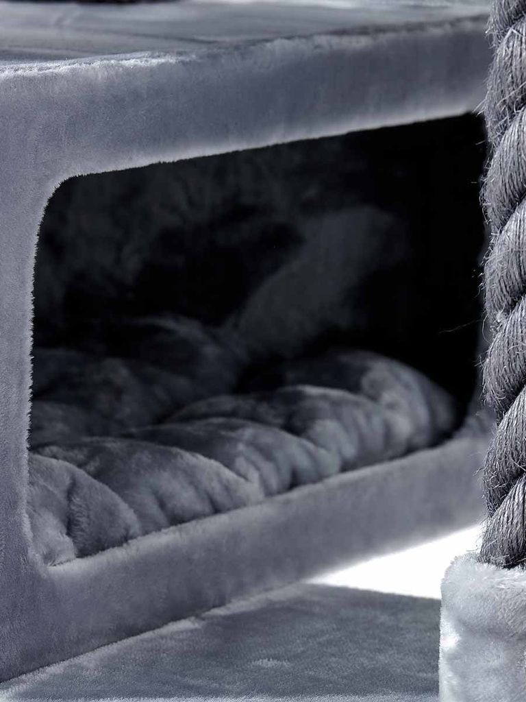 Det är sammetsmjuka kuddar i klösträdet, både i hängmattan och i det stora grottorna så din katt kan gå in och lägga sig bekvämt. Din katt kommer att få en gosig sömn eller vila på sin helt egna plats där den kan trivas i sin ensamhet.