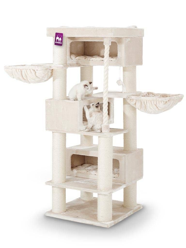 Hängmattorna är i ett mjukt sammets material och kommer få dina katter att sova hur bra som helst då dom får värme och ett bekvämt underlag. Det är även två stora kattgrottor i klösträdet där dina katter kan gosa in sig när dom vill vara ifred och ta en riktigt mysig vilostund på det mjuka gossiga underlaget.