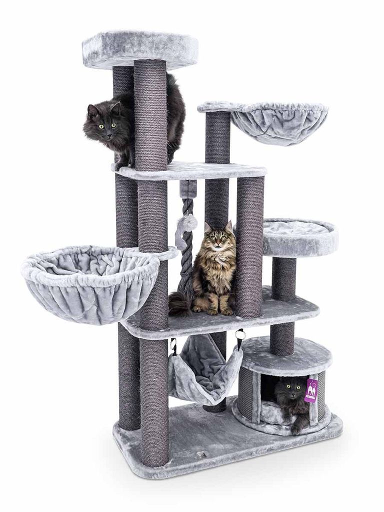 Detta klösträd har extra tjocka klöspelare med en diamter på 12mm och extra många bekväma och gosiga ställen för din katt att vila på. Det finns två stycken hängmattor med mjukt och gosigt material som dina katter kommer sova bekvämt i. Det finns även en massa plats att klösa på vilket är bra för deras klor då dom slipas och vässas.