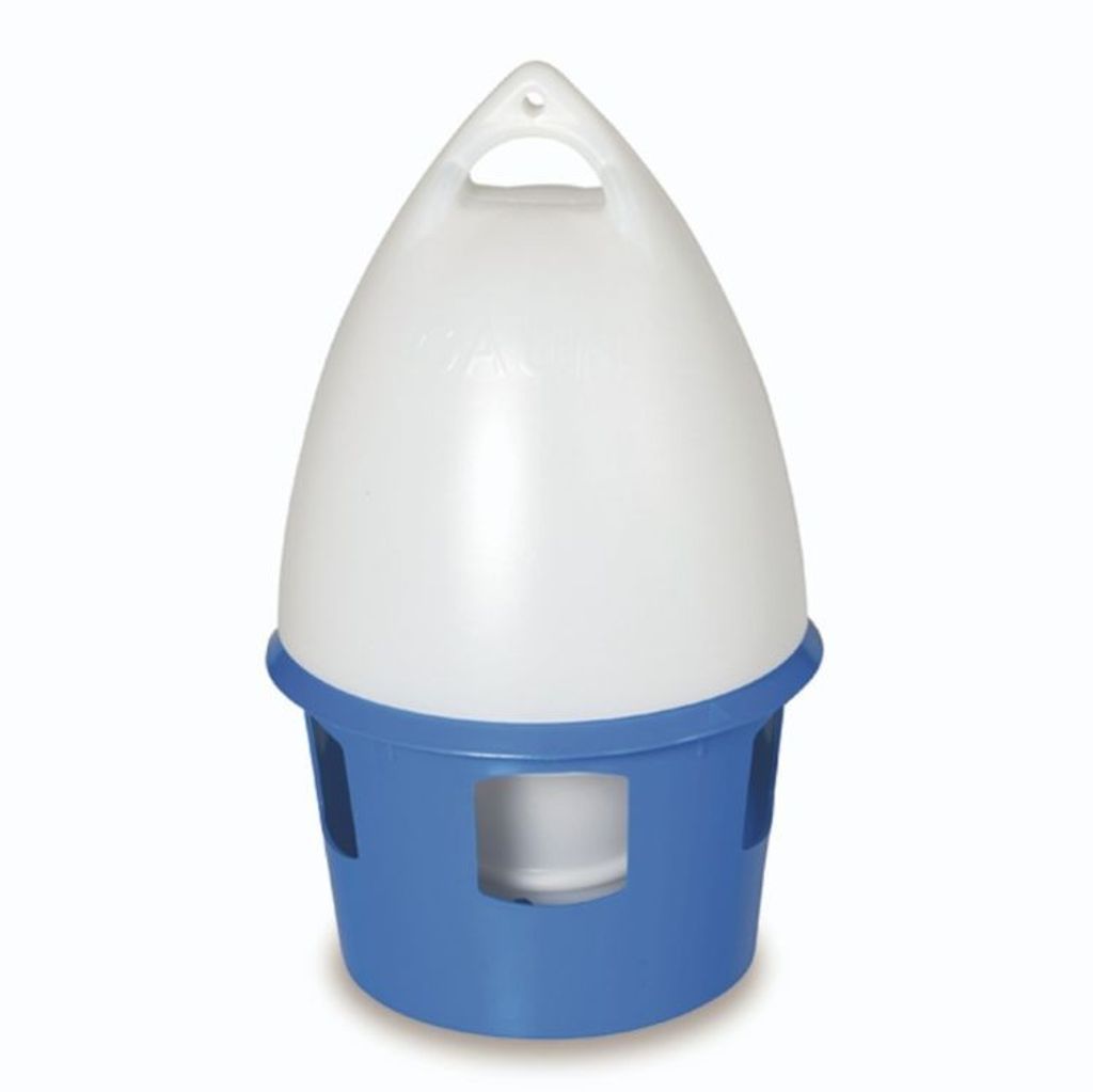 En praktisk foder- eller vattenautomat för duvor som rymmer cirka 8 liter. Konstruktionen är utformad för att hålla fodret eller vattnet skyddat inne i automaten, vilket minskar risken för nedsmutsning. Tack vare den smarta formen finns det få ytor där smuts kan ansamlas, vilket gör den både hygienisk och enkel att hålla ren.